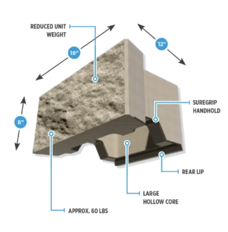 NEW PRODUCT! The Fortus 12D® is the newest retaining wall unit by CornerStone® Wall Solutions and is built with a multi-purpose hollow core that makes it easy to install. It also has excellent drainage capabilities and equipped with built-in patented SureGrip® handholds that make lifting and installation easier. Lastly, the Fortus 12D® has a rear lip that makes for consistent setbacks and alignment when installing.